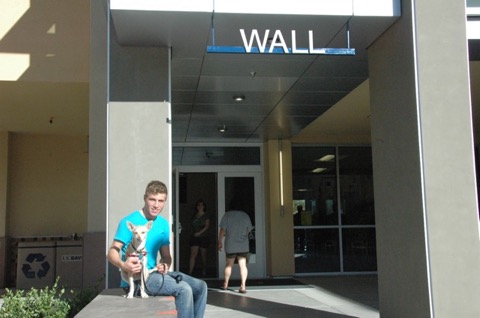 In this photo Harley and dog Tybalt outside newly constructed Wall Dorm at UC Davis. Wall is Harley's freshman dorm for Fall, 2010. Harley's father Michael Grandin says, "It's [Wall Dorm] so brand new, they're still working on the landscaping.  Wall is one of the newest dorms in a group called Tercero on the west side of campus. Harley is in the honors program, as are most or all of his dorm mates.  He'll be taking four classes and plans to start training for triathlons.  Classes start Thursday [23 September 2010]." Tybalt had been in the family for about a month at the time of this photo. He is a gift from Harley to his dad.