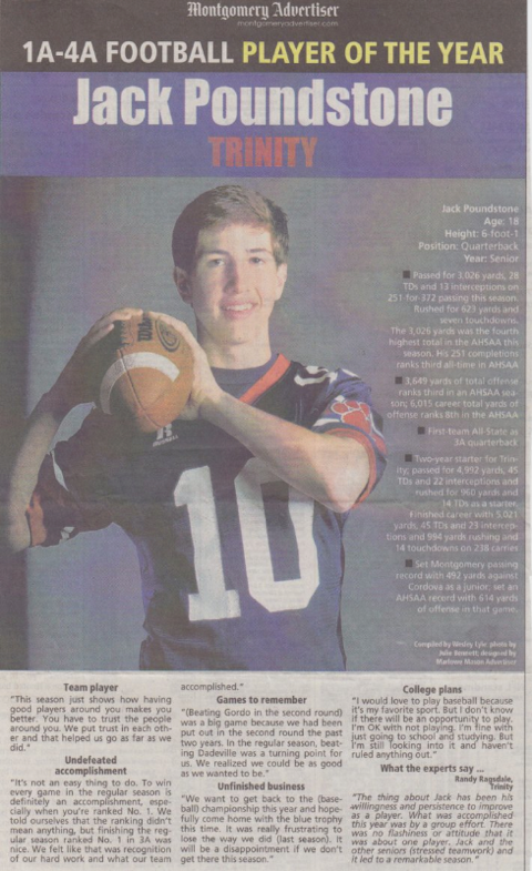 "1A-4A Football Player of the Year: Jack Poundstone" as printed in the Montgomery Advertiser. Compiled by Leslie Lyle; photo by Julie Bennett. designed by Marlowe Mason Advertiser.