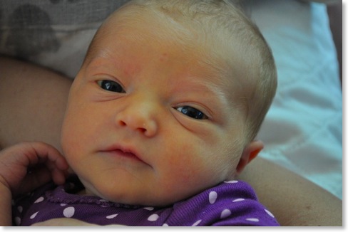 Mother Karrera Irene (“Kari”) Starr Beck holds her newborn daughter, Emerson Irene Beck. Emerson Irene is the granddaughter of Sharon Frances "Sha" Johnson Starr and great-granddaughter of Luke and Shirley Roach Johnson (Uncle Luke and Aunt Shirley). Photo taken 31 August 2010 (day of birth).
